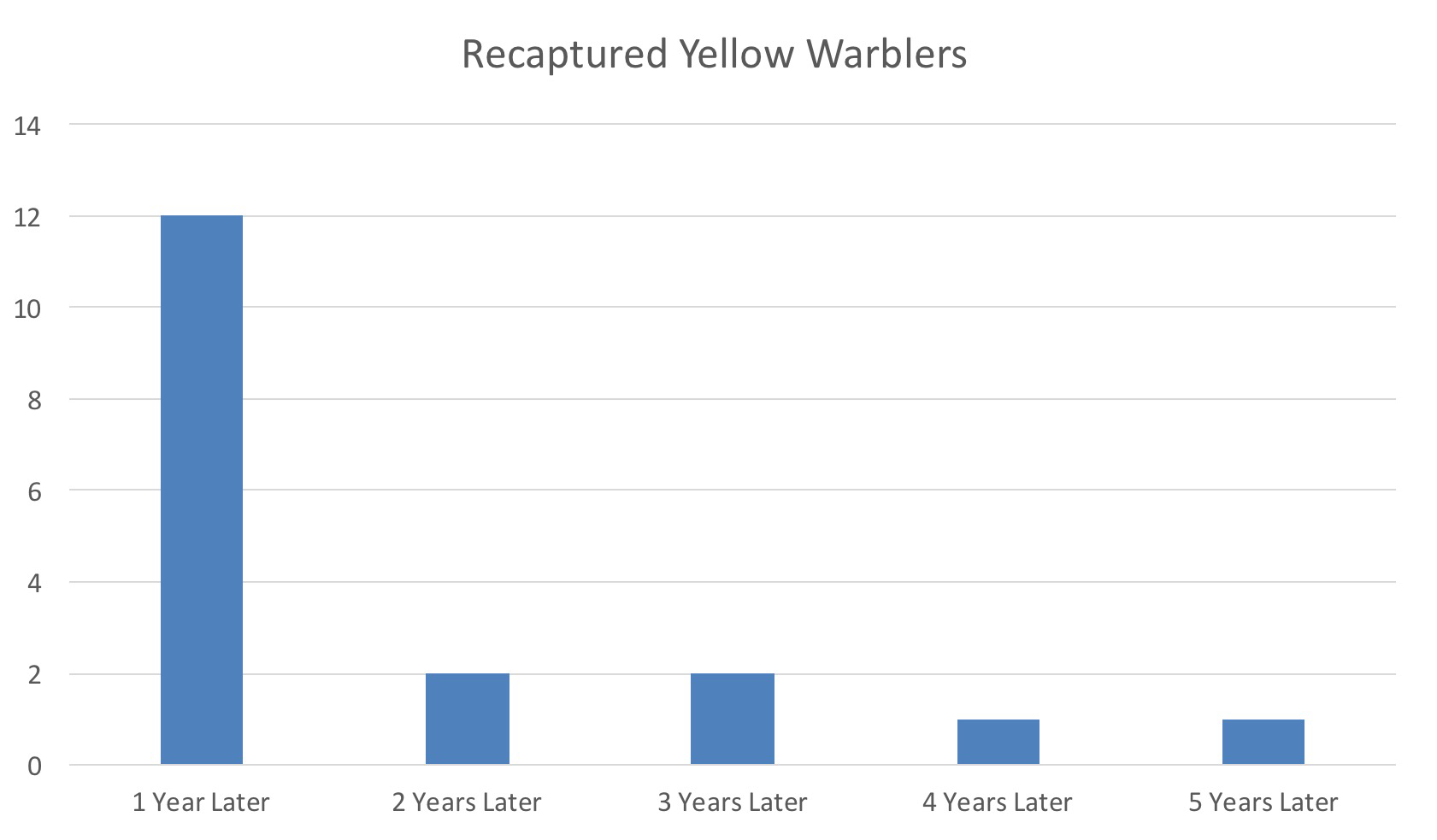 I observed 8.9% of my banded Yellow Warblers to return back to the breeding grounds after migrating south. I had 12 individuals return the following year, 2 individuals return two years later, 2 individuals return three years later, 1 individual returns four years later and 1 individual return five years later. What was very unique about the recapture (five years later) was that warbler was one of few female recaptures.